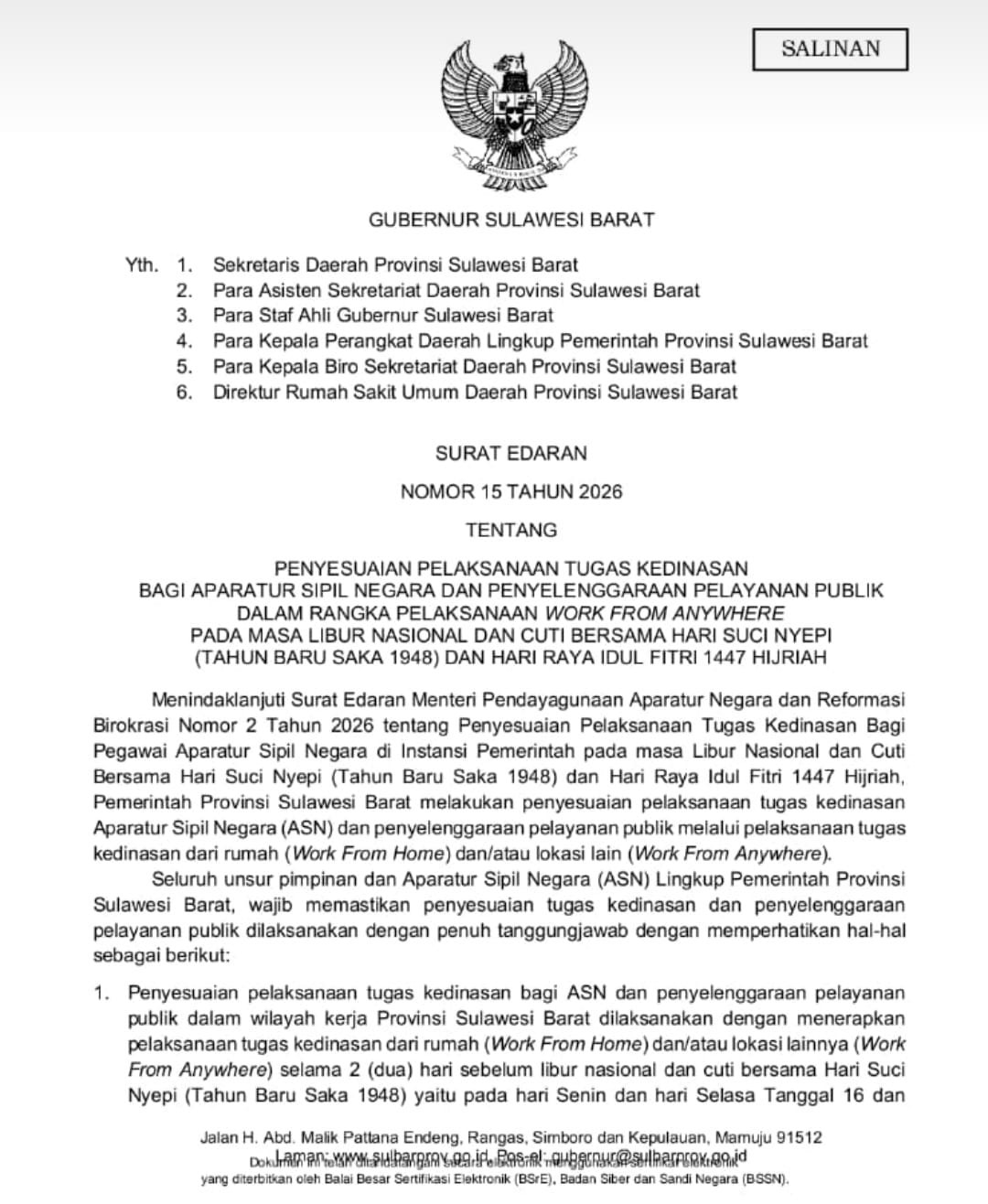 Terkini | • Maret 7, 2026 • Gubernur Sulbar Terbitkan SE WFA bagi ASN Jelang Nyepi dan Idul Fitri 1447 H Mamuju – Pemerintah Provinsi Sulawesi Barat menerapkan penyesuaian pelaksanaan tugas kedinasan bagi Aparatur Sipil Negara...