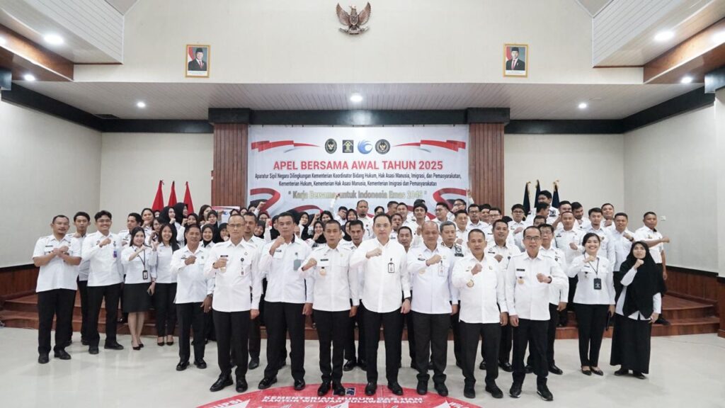 Apel awal tahun 2025 ini juga diikuti ASN Kemenko Bidang Hukum, HAM, Imigrasi dan Pemasyarakatan, Kementerian Hukum, Kementerian HAM, Kementerian Imigrasi dan Pemasyarakatan memiliki tema “Kerja Bersama, untuk Indonesia Emas 2045”.