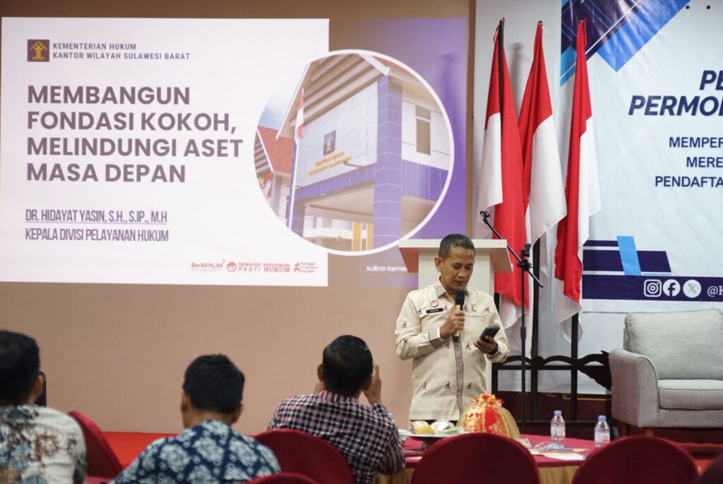 “Hal ini sebagai upaya konkret pemerintah dalam memberikan kemudahan akses layanan hukum sekaligus mendorong pelaku UMKM untuk memiliki legalitas usaha secara menyeluruh,” ujarnya usai membuka pelaksanaan pendampingan pengajuan permohonan Kekayaan Intelektual yang dilaksanakan di Hotel Aflah, Kabupaten Mamuju.