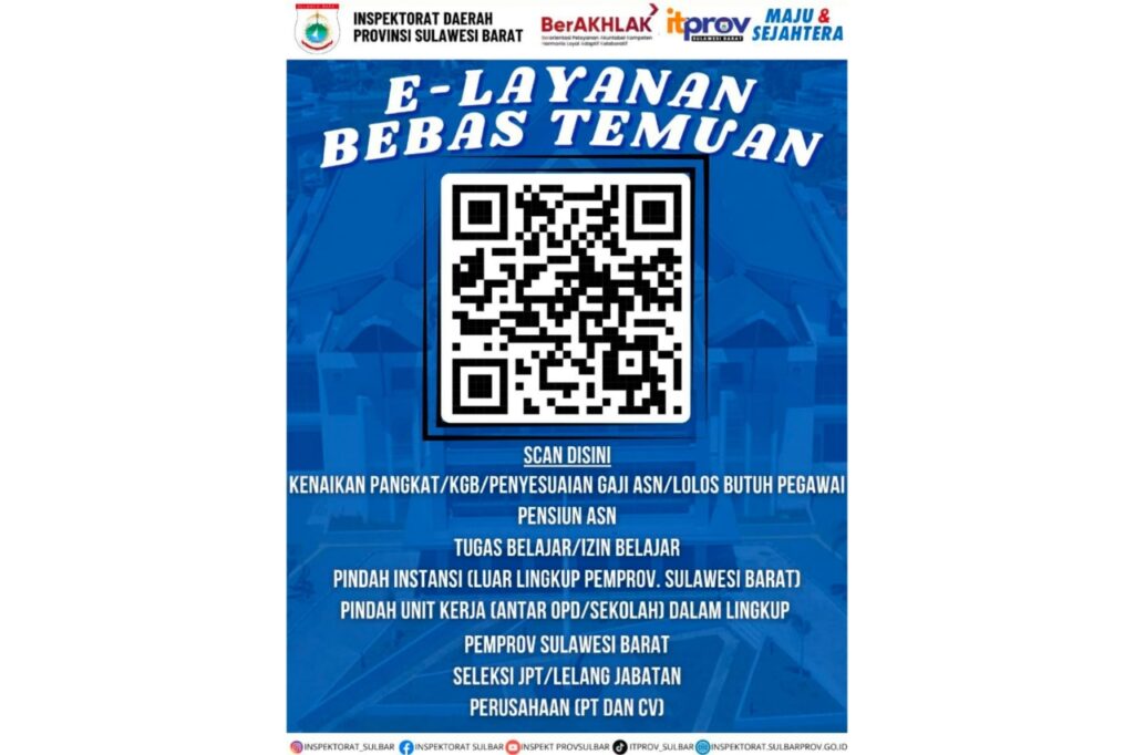 Mamuju – Inspektorat Sulawesi Barat meluncurkan aplikasi E-Layanan bebas temuan dengan mendekatkan layanan. Hal ini, menindaklanjuti visi-misi Gubernur Sulbar Suhardi Duka dan Wakil Gubernur Salim S Mengga dalam sektor layanan pemerintahan yang profesional.