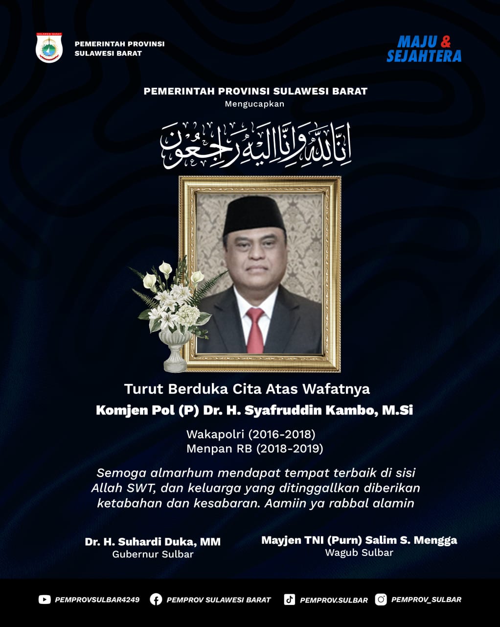 JAKARTA – Pemprov Sulbar menyampaikan belasungkawa yang mendalam atas wafatnya Komjen Pol (P) Dr. H. Syafruddin Kambo.